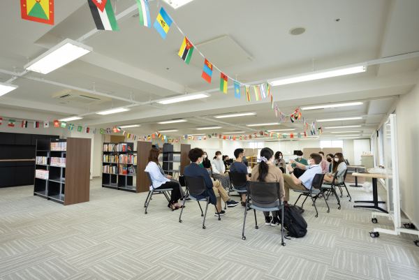 There is The English Lounge for students where English news is always on and the English news-paper available, so they can continue showering English out of classrooms. Information on foreign students' countries of origin and living-tips in Hiroshima will be posted so that students can learn from each other and communicate further.