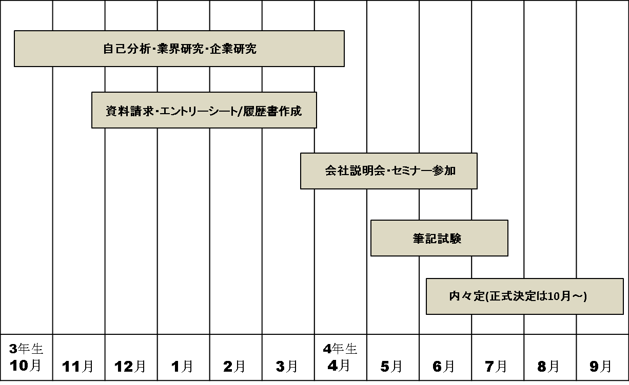 あなたが曰本企業への就職活動を行う時は、このスケジュールの流れを知っておく必要があります。就職活動の内容は、基本的には日本人と同じです。さまざまな方法で資料を調べ研究し、興昧のある会社とコンタクトをとることになります。