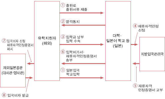 입학허가서를 받은 후부터 일본에 입국할 때까지의 수속의 흐름을 표에 나타내었습니다. 참고하십시오.